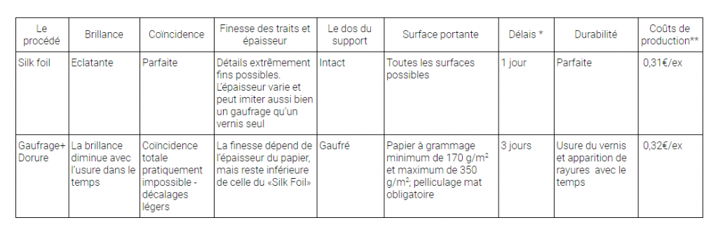 Dans le tableau ci-dessous vous avez une comparaison du « Silk Foil » et de la dorure classique avec gaufrage.